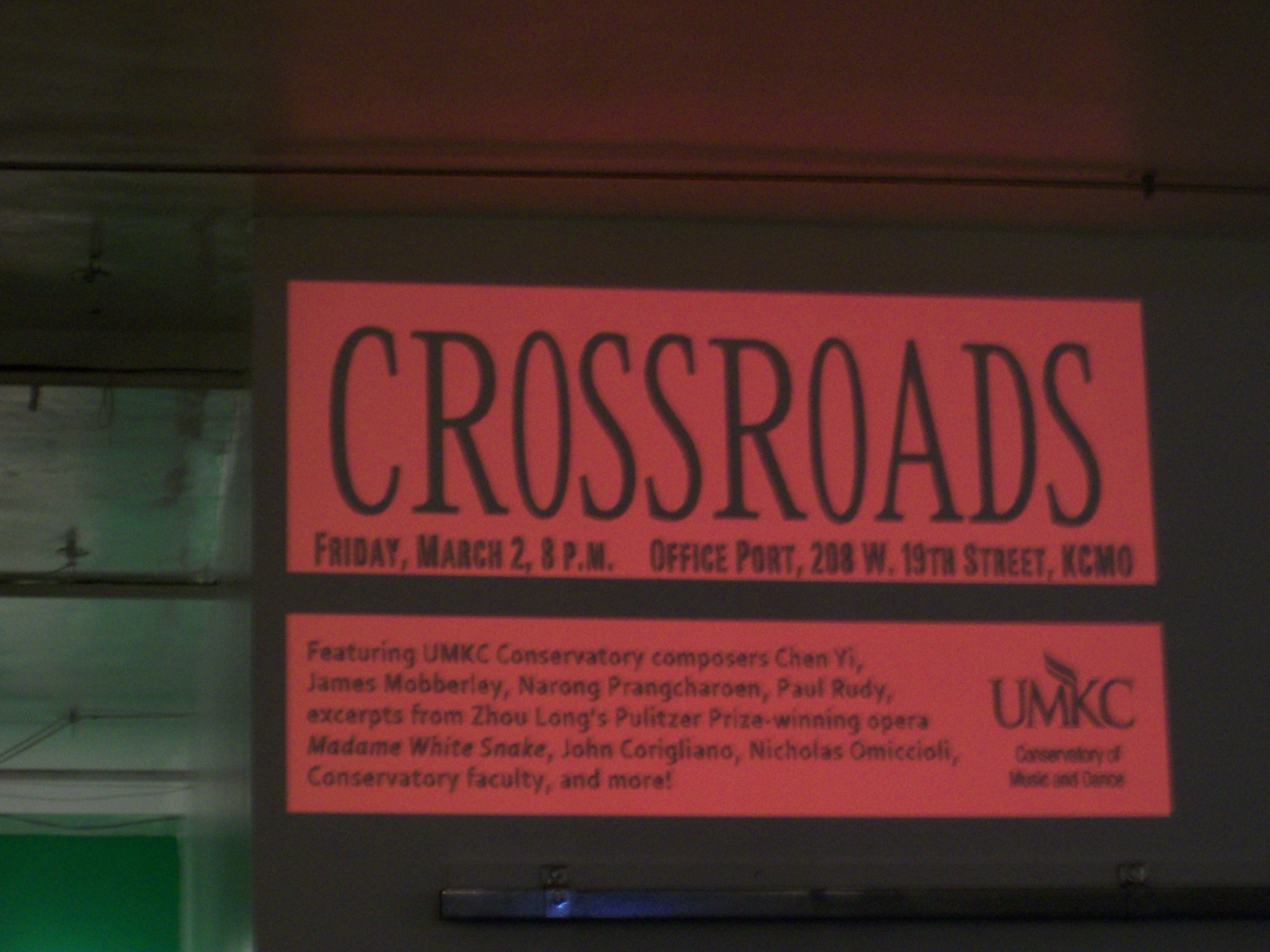 First on the agenda was “Crossroads,” a preview performance by UMKC composers, students, alumni for their showcase at (le) Poisson Rouge this coming Friday. I covered it for The Kansas City Star (in print Tuesday, March 6) and was hard put to fit the breadth of compositional style and the quantity of excellent performances into the page space.