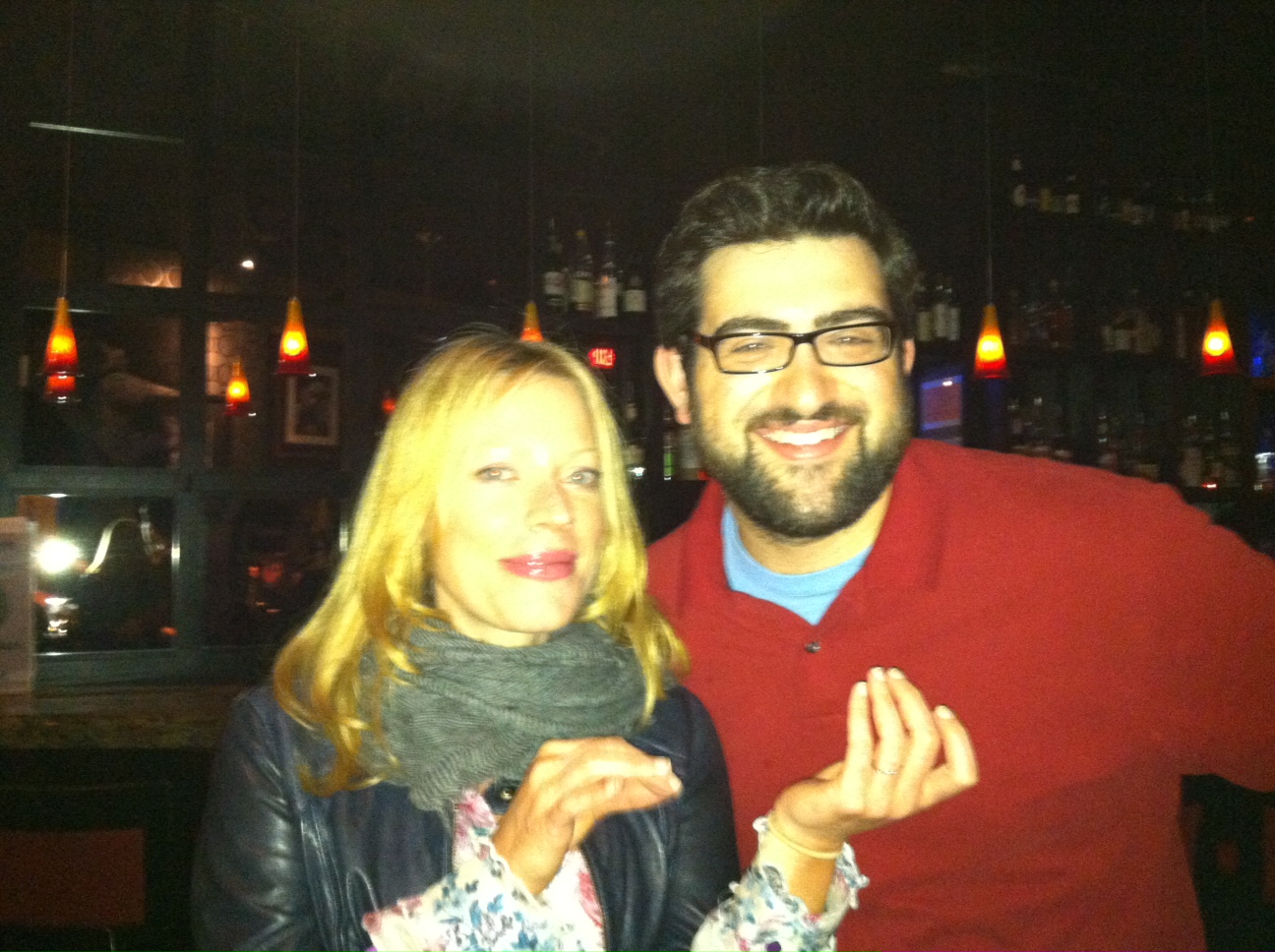 My husband was in the band and I followed the show’s progress with more than a little interest. According to family lore, Scott babysat him and his sister, having grown up down the street, before she headed off for the far-less-greener pastures of Manhattan. She also took violin lessons with his mother. So when Scott came to see the show and then out for drinks afterwards with the cast, my husband snapped a picture of her “air-violining.” It’s a small world.