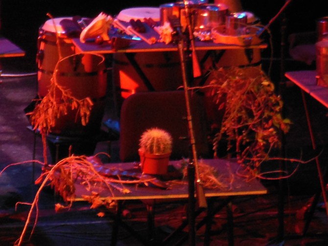 We attended a christening on Thursday night. From the stage of the Lied Center in Lawrence KS, the members of Brooklyn-based Sō Percussion took suggestions to name the cactus that they were using for the first time, a Kansas resident. According to them, cacti have female names. Therefore, Meredith Marsha Helga Jayhawk debuted on John Cage’s Child of Tree, played by Josh Quillen.