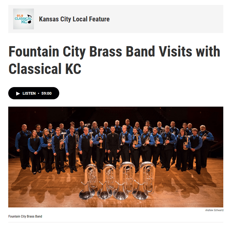 Classical KC | Fountain City Brass Band I guest co-hosted a segment of Classical KC’s “Local Feature,” talking with leaders of the award-winning Fountain City Brass Band. Classical KC is the new classical music station, a sister station of KCUR. Listen here! Share this:Share Click to share on X (Opens in new window) X Click to share on Facebook (Opens in new window) Facebook Click to email a link to a friend (Opens in new window) Email Click to print (Opens in new window) Print Related Leave a comment Cancel reply Δ